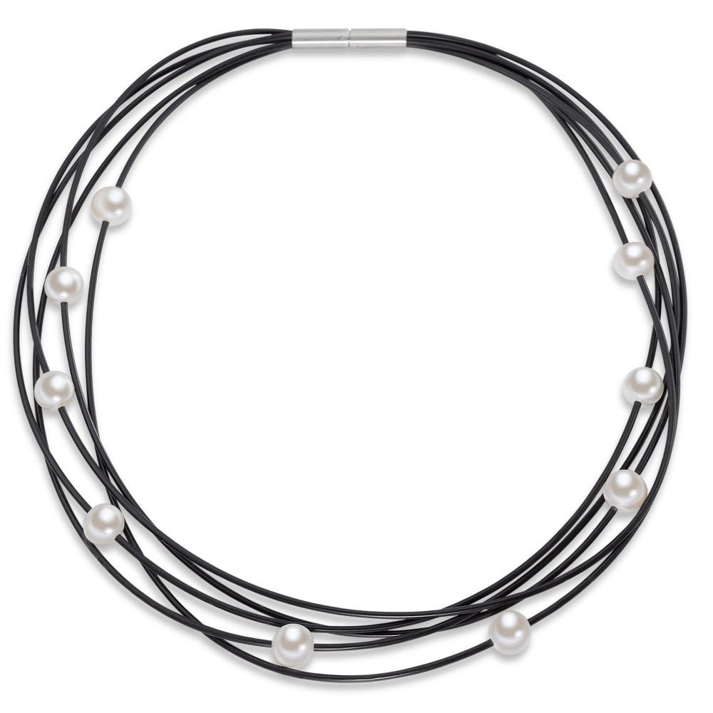 Collier Elegantes Damen Collier aus hochwertigem Edelstahl und flexiblem Kautschuk. Das dreireihige Design wird durch fünf edle Süßwasserzuchtperlen stilvoll akzentuiert. Ein zeitloses Schmuckstück, das modern und klassisch zugleich begeistert. Ideal für jeden Anlass. T-015.08PW01.42